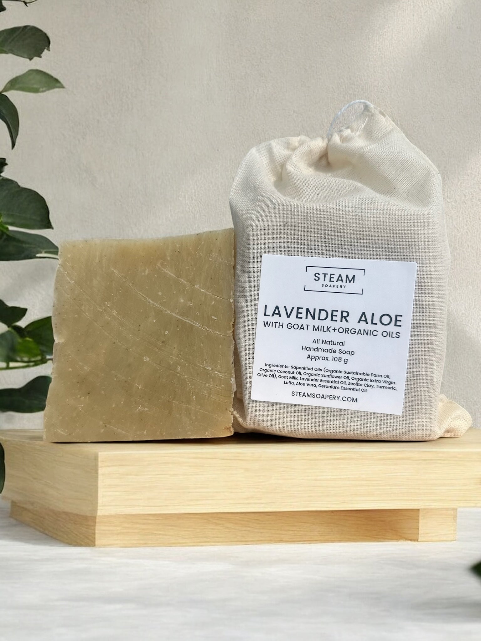 Ingredients: Saponified Olis (Organic Sustainable Paim Oil, Organic Coconut Oll, Organic Sunflower Oil, Organic Extra Virgin Olive Oil), Goat Milk, Lavender Essential Oil, Zeolite Clay, Turmeric, Luffa, Aloe Vera, Geranium Essential Oil