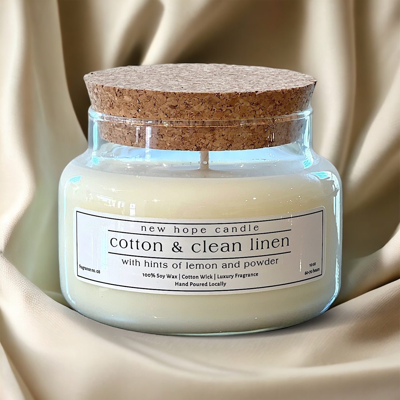 Light up your space with our No. 8 Cotton & Clean Linen soy candle! This unique blend of cotton and clean linen boasts refreshing hints of lemon and sandalwood. Enjoy the benefits of a clean and inviting atmosphere. (Warning: may cause extreme relaxation!)